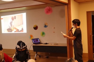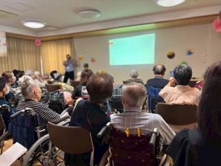 今年の敬老行事では、映像を使ったスライドショーを上映し、これまでの行事や日常の思い出を皆さまと一緒に振り返りました。画面には、春のお花見や夏祭り、運動会、レクリエーションなど、さまざまな活動の笑顔が映し出され、ひとつひとつの場面に歓声や笑い声があがりました。懐かしい映像を前に、「あの時は元気いっぱいだったね」「みんなで頑張ったよね」といった会話も自然に広がり、会場全体があたたかい空気に包まれました。