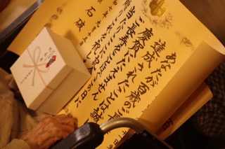 さらに、今年は100歳を迎えられたご入居者様のお祝いも行いました。職員より表彰状と記念品をお渡しすると、ご本人も照れながら笑顔を見せられ、その姿に会場からは大きな拍手が起こりました。ご家族や他のご入居者様からも「すごいね」「おめでとうございます」と祝福の声が寄せられ、長寿を讃える喜びを皆で分かち合う時間となりました。