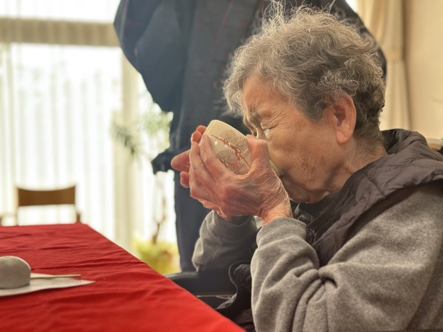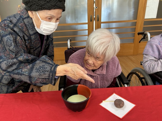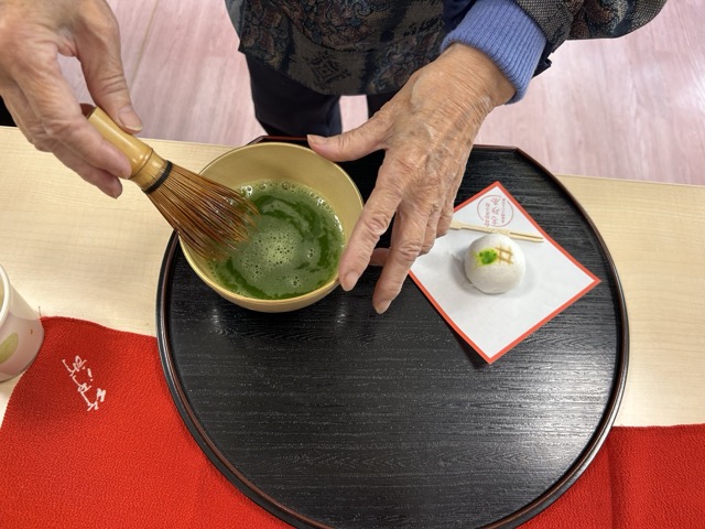 お茶会では、職員が着物や羽織を身にまとい、お一人ずつに抹茶を点てておもてなししました。お茶の香りが広がる中、「ええ香りやね」「昔、家でお茶をしてたことを思い出すわ」と、懐かしそうに話される方もいらっしゃいました。