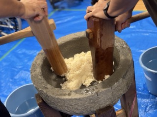 会場には臼と杵が並び、「よいしょ!」という掛け声とともに、にぎやかな音が響きます。