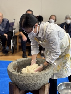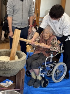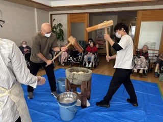 職員が息を合わせて餅をつく様子を、入居者様に見守られ、自然と笑顔に。