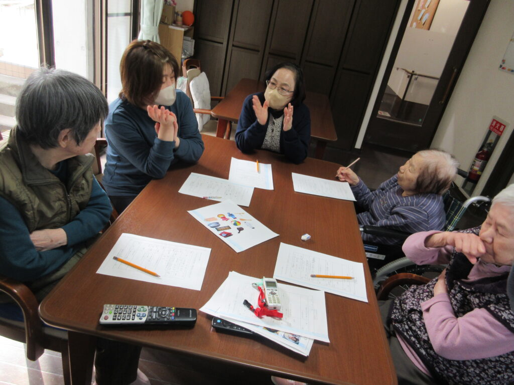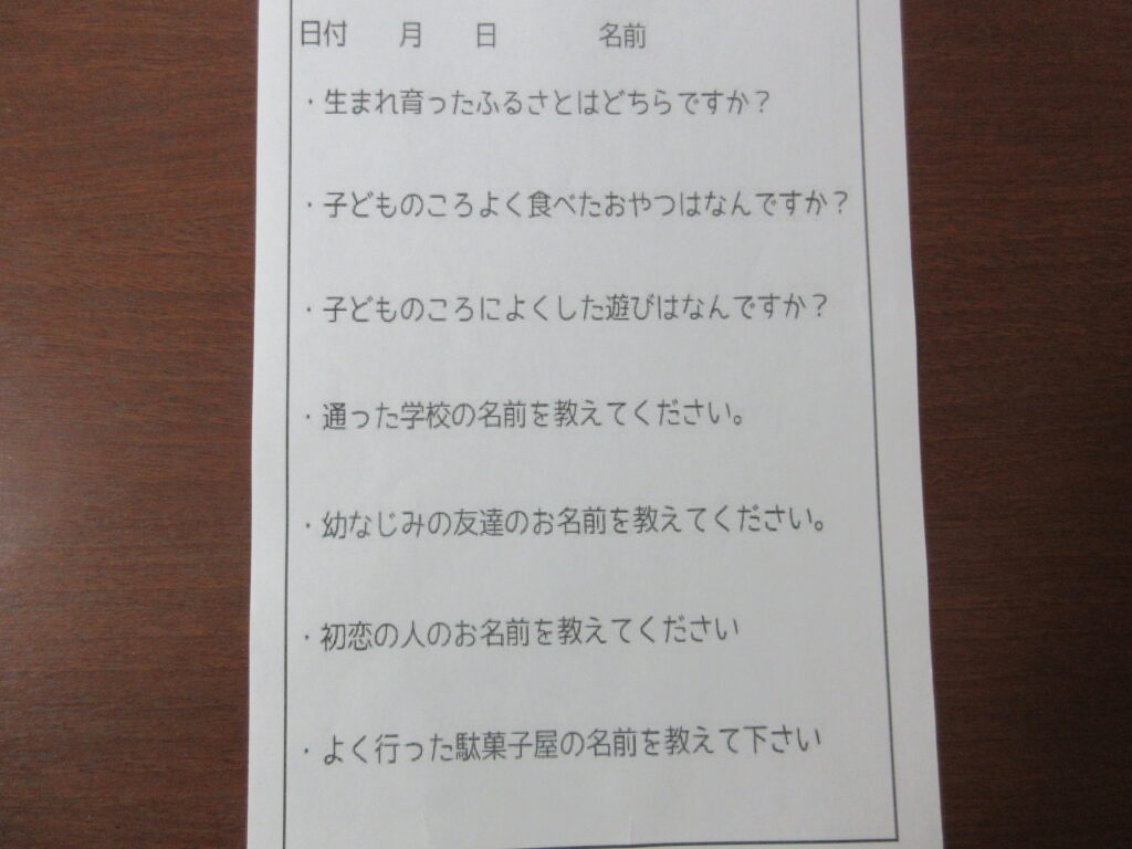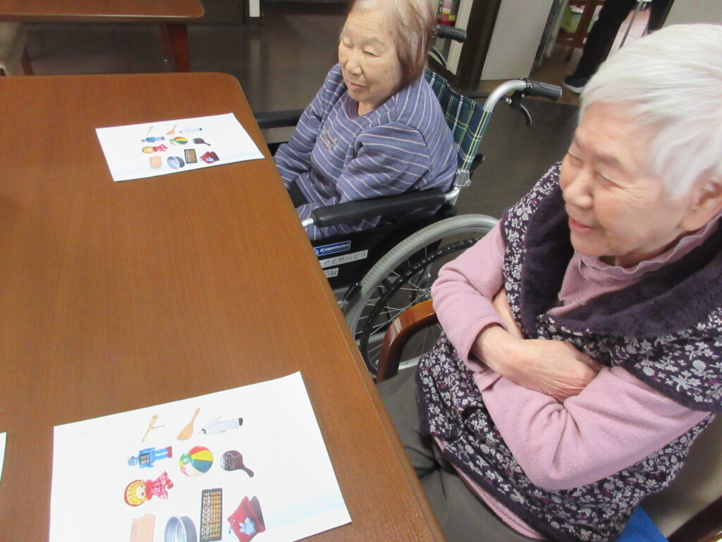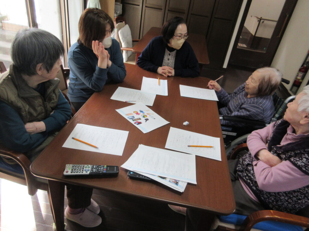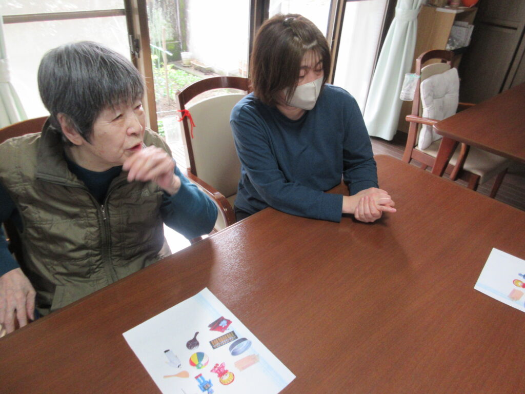 今月の回想クラブでは、昔の事を紙に書き出してもらったり、子供の頃に使っていた物を絵で見てもらいながら、利用者と職員と一緒にお話しをさせていただきました。