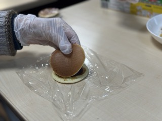 焼きあがった生地に、あんことさつまいも、栗を挟み、ひとつずつラップで包みます。